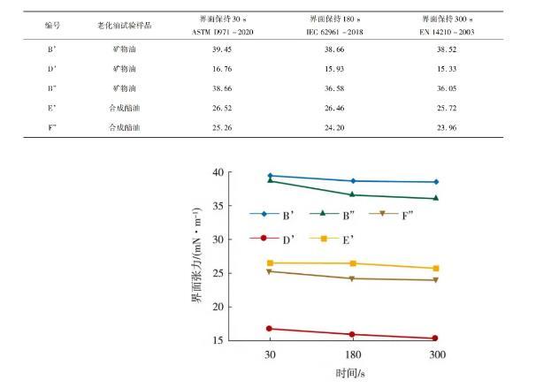 IEC62961:2018方法介于ASTMD971方法和EN14210方法之間,在界面形成180s時測量界面張力更加符合實際,同時測量時間對測量結果影響較小。從圖3和圖4也可以看出,老化油的界面張力隨時間變化較為明顯,主要表現(xiàn)在界面張力曲線從30s到180s的變化斜率較大,而在界面形成的180s時測量界面張力數(shù)值與300s的測量數(shù)據(jù)很接近,可以提供一個較為真實的界面張力值,并且檢測時間相對較短。