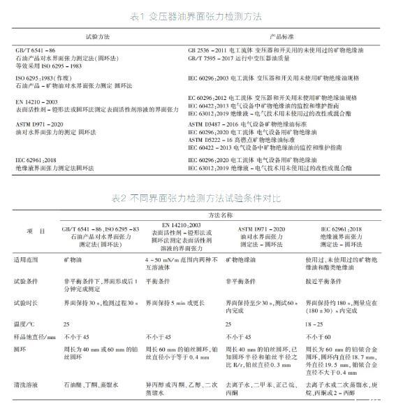 方法:不同產(chǎn)品標準所采用的界面張力檢測方法不同,具體如表1和2所示??梢钥闯?,各方法的測量原理相同,測定絕緣油的界面張力的方法大都采用的是圓環(huán)法,主要區(qū)別就是界面形成后即非平衡條件、接近平衡條件及平衡條件下測試的保持時間不同。