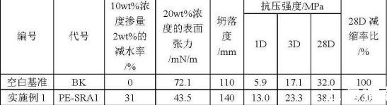 按上面步驟制備的減水劑進(jìn)行配比,采用基準(zhǔn)水泥或者代用的工程普通水泥,砂率39wt%,配合比(質(zhì)量比)為水泥:砂子:碎石=330:720:1100,PE±SRA減水劑10wt%濃度摻量2wt%,通過(guò)調(diào)整用水量控制混凝土坍落度在90-145mm,檢測(cè)后得知,PE-SRA系列與PE+SRA系列的表面張力相近,但相同摻量條件下PE-SRA系列的減水率和減縮效果遠(yuǎn)遠(yuǎn)好于PE+SRA系列。