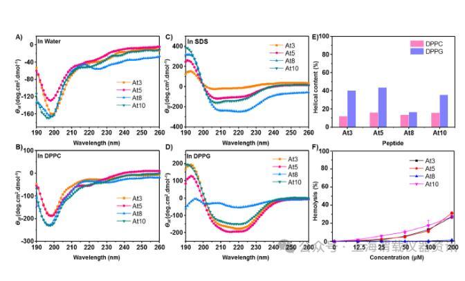 圖2、設計肽的二級結(jié)構和溶血特性。(A)水、(B)25 mM SDS、(C)兩性離子DPPC SUV(0.25 mg mL-1)和(D)帶負電荷的DPPG SUV(0.25 mg mL-1)中肽的CD光譜。所有四種肽(At3、At5、At8、At10)在水和DPPC SUV中均呈現(xiàn)無規(guī)卷曲結(jié)構,而在SDS和DPPG SUV中均采用螺旋結(jié)構。肽濃度固定在0.1 mM。所有測量均在室溫下進行。(E)DPPC和DPPG SUV中肽的α-螺旋含量。(F)肽的溶血活性。用不同濃度的肽處理人紅細胞(hRBC)并在37°C下孵育1小時。然后在OD540nm處測量吸光度。