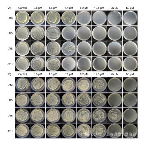 圖1、用于確定(A)大腸桿菌和(B)金黃色葡萄球菌中肽的最低殺菌濃度(MBC)值的細菌培養(yǎng)物。
