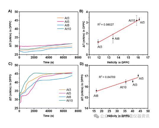 圖4、(A和C)在亞相中注射抗菌肽后DPPC和DPPG脂質(zhì)單層的表面壓力變化。(B和D)分別在注射抗菌肽(AMP)后DPPC和DPPG脂質(zhì)單層表面壓力的增加與DPPC和DPPG中AMP的螺旋度之間的相關性。注射抗菌肽后兩性離子DPPC脂質(zhì)單層表面壓力的增加非常小,而陰離子DPPG脂質(zhì)單層表面壓力的增加相當高。
