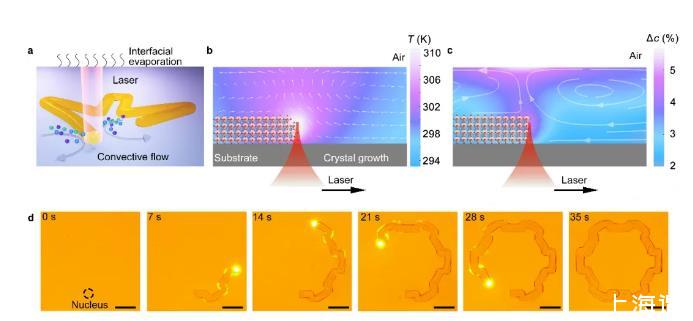 研究者利用COMSOL模擬了激光照射下鈣鈦礦晶體周?chē)木钟蜻^(guò)飽和度,并通過(guò)實(shí)驗(yàn)驗(yàn)證了過(guò)飽和度產(chǎn)生的原理。其中馬倫格尼對(duì)流的引入加速了傳質(zhì)過(guò)程,使得鈣鈦礦結(jié)構(gòu)能夠在激光誘導(dǎo)下快速生長(zhǎng),在實(shí)驗(yàn)中,MAPbBr3鈣鈦礦單晶的生長(zhǎng)速度可達(dá)0.1 mm/s,顯著快于傳統(tǒng)的鈣鈦礦單晶制備方法。激光閾值功率約為150μW,低于現(xiàn)有的激光調(diào)控鈣鈦礦結(jié)晶過(guò)程方法。