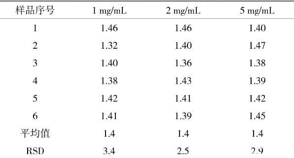 在150℃加熱10 min的測(cè)定條件下,采用滴定度為1 mg/mL的費(fèi)休氏試劑,用卡氏干燥爐自動(dòng)進(jìn)樣法測(cè)定樣品中水分含量,樣品測(cè)定6次,計(jì)算6次結(jié)果的相對(duì)標(biāo)準(zhǔn)偏差(RSD%)數(shù)據(jù)見(jiàn)表5。結(jié)果表明測(cè)定結(jié)果具有良好的重復(fù)性。