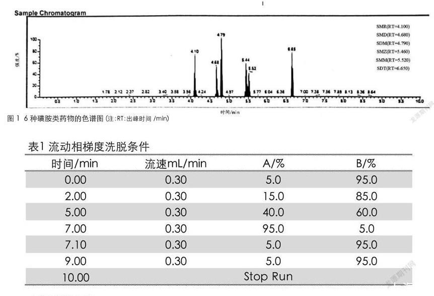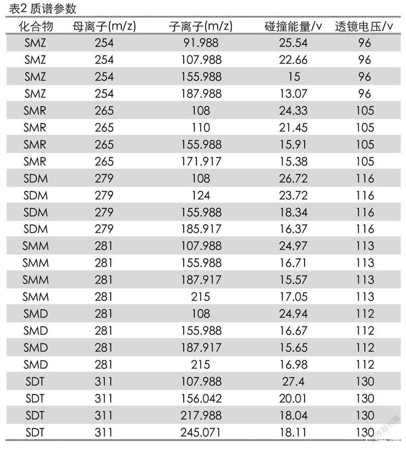 6種磺胺類(lèi)標(biāo)準(zhǔn)物質(zhì):磺胺甲惡唑(SMZ)、磺胺甲基嘧啶(SMR)、磺胺間二甲氧嘧啶(SDM)、磺胺間甲氧嘧啶(SMM)、磺胺對(duì)甲氧嘧啶(SMD)、磺胺地索辛(SDT)(純度均大于99.5%,北京振翔科技有限公司);乙腈(色譜純,德國(guó)Merck公司);甲酸(色譜純,上海安普實(shí)驗(yàn)科技有限公司)。