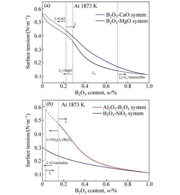2)含B2O3二元體系中,熔渣表面張力隨B2O3含量的增加而降低,作為表面活性物質(zhì),B2O3組元能顯著降低熔渣表面張力。純氧化物表面張力值與形成氧化物的陽離子靜電勢及氧化物中離子鍵分數(shù)有關(guān)。