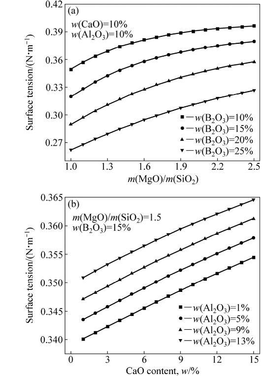 3)含B2O3三元體系熔渣表面張力隨著B2O3含量的增加而顯著降低;隨著SiO2含量、Al2O3含量、MgO含量和CaO含量的增加,熔渣表面張力逐漸增大。