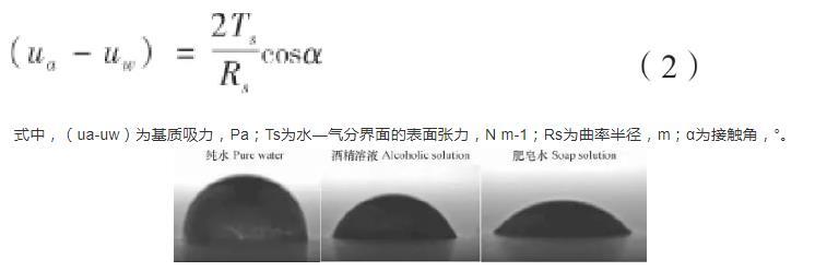 由上式可以看出,基質吸力的大小與表面張力、接觸角和曲率半徑有關。其中,基質吸力的大小與表面張力成正比,與彎液面曲率半徑成反比。因此,表面張力和曲率半徑的變化均會導致基質吸力的改變。在環(huán)境溫度為25℃時,通過JC2000型接觸角測量儀對三種試樣的孔隙液體進行接觸角測量。得到三種不同表面張力液滴的幾何形態(tài)圖如圖4所示,測量可得純水、酒精溶液和肥皂水對應的接觸角分別為85°、65°和42°,而在25℃環(huán)境下,純水、20%酒精溶液、2 g L-1肥皂水的表面張力系數(shù)分別為:7.1×10-2N m-1、4.1×10-2N m-1、2.9×10-2N m-1。表面張力是決定彎液面形狀的主要因素之一,會影響曲率半徑和接觸角的大小。很顯然,表面張力大的液體接觸角變大,曲率半徑變小。圖4中水滴表面張力大于酒精溶液,但形成的彎液面半徑卻要小于酒精溶液,同樣的,酒精溶液形成的彎液面半徑又小于肥皂水。曲率半徑越小,土體中的基質吸力越大。孔隙水表面張力會對彎液面的曲率半徑產(chǎn)生改變從而對基質吸力產(chǎn)生影響,最終影響土壤的收縮開裂。