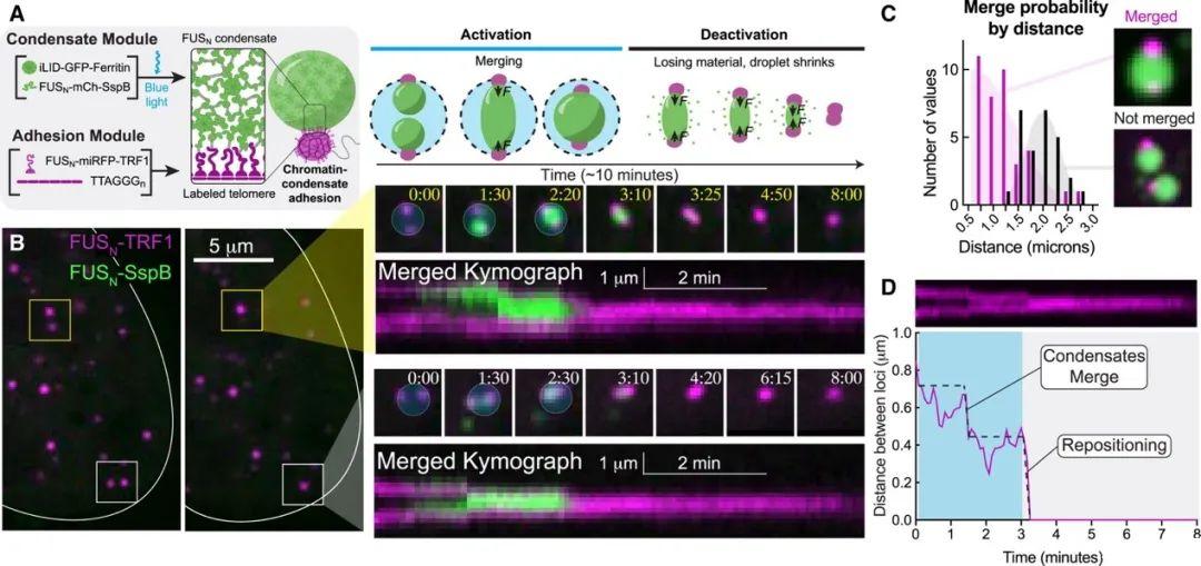研究者在U2OS細胞中使用了雙組份Corelet系統(tǒng)2作為“凝聚體模塊”(創(chuàng)造凝聚體的結(jié)構(gòu)),它由一個iLID-GFP-Ferritin 24聚體“核心(core)”和一個帶有SspB標記的固有無序區(qū)(IDR)組成。在488nm光照下,iLID與SspB相互作用,在每個核心上添加多個IDR,并觸發(fā)細胞內(nèi)的相分離。通過將相同的IDR(例如FUSN)與一種結(jié)合特定染色質(zhì)位點的錨定蛋白(結(jié)合重復(fù)端粒TTAGGG序列的TRF1蛋白)作為“黏附模塊”(創(chuàng)造凝聚體與染色質(zhì)位點之間相互作用的結(jié)構(gòu)),來促進兩個模塊之間的相互作用(圖1A和1B)。