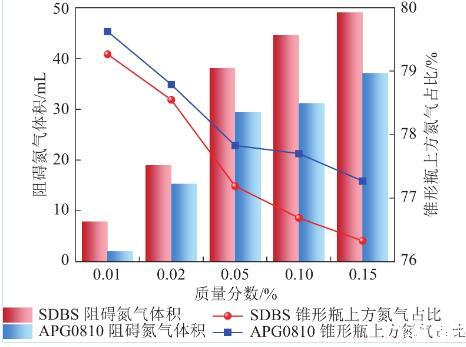 表面活性劑泡沫對氮氣緩釋作用結(jié)果如圖11所示。相同質(zhì)量分數(shù)下,SDBS溶液對氮氣的緩釋效應(yīng)優(yōu)于APG0810,質(zhì)量分數(shù)為0.15%時,SDBS和APG0810溶液泡沫阻礙氮氣體積分別為49.102 mL和37.042 mL。
