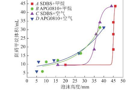 4)泡沫穩(wěn)定性是決定甲烷緩釋效應(yīng)的關(guān)鍵因素,泡沫穩(wěn)定性越強,越能有效控制甲烷流動??芍苯硬扇】諝?表面活性劑泡沫的各項參數(shù)表示泡沫性質(zhì)。陰離子表面活性劑SDBS表現(xiàn)較好,泡沫穩(wěn)定性較強,隨著時間推移,SDBS也有比APG0810更好控制甲烷釋放的效果。質(zhì)量分數(shù)為0.15%時,10 min內(nèi)SDBS可以控制約占總通入甲烷體積87%的甲烷。120 min后仍可控制約占通入總體積49.16%的甲烷。