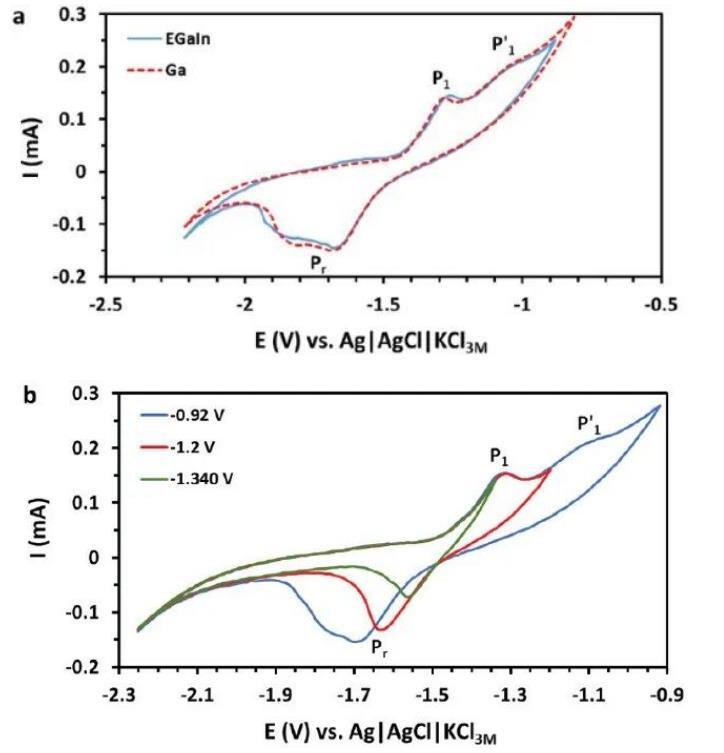 圖2(a)在300 mV/s掃描速率下,鎵銦合金液滴在1 M NaOH中的循環(huán)伏安圖。(b)不同掃描速率(50至600 mV/s)下的鎵銦合金液滴循環(huán)伏安圖。