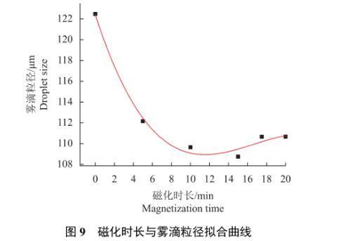 1)在0~500 mT磁場強度范圍內(nèi),當磁場強度為350 mT、磁化時間為15.0 min時,表面張力最小,為54.0 mN/m,下降14.96%;噴霧霧滴粒徑最小,為108.75μm,下降11.20%。溶液表面張力和噴霧霧滴粒徑隨磁場強度和磁化時長的增加均呈現(xiàn)先下降后回升的趨勢,表明只有在特定磁場強度和磁化時長范圍內(nèi)磁化效果才最佳。