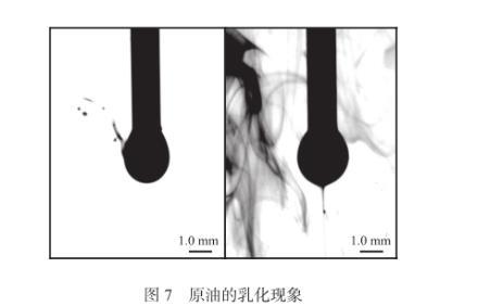 實驗中觀察到DTAC與SDS都可以將油水兩相的界面張力值降低到1.00 mN/m以下,在這種條件下,易發(fā)生表面活性劑水溶液乳化原油的現(xiàn)象,此時,乳化的原油被分散并且逐步溶解到表面活性劑水溶液中,原本無色透明的表面活性劑水溶液轉(zhuǎn)變?yōu)辄S色渾濁狀態(tài)。圖7是50℃、CO2壓力為4.0 MPa時,飽和CO2的DTAC水溶液中,原油被拉絲,乳化的過程。
