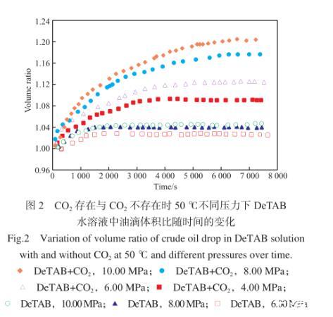 圖2為50℃下,CO2存在與CO2不存在時,DeTAB水溶液/原油體系中,油滴的體積與初始體積比隨時間的變化。由圖2可知,對于原油/CO2/DeTAB水溶液體系,在初始階段,油滴體積增加較快,在油滴體積增加到平衡值附近后,體積增加變緩慢。油滴體積達(dá)到穩(wěn)定所需時間在3 500~6 500 s范圍內(nèi)。同時,隨著壓力的升高,油滴的平衡體積與初始體積比逐漸增大,這與原油體積膨脹系數(shù)隨著CO2壓力增大而增大相吻合。不含CO2的DeTAB水溶液/原油體系中,油滴體積達(dá)到平衡值所需時間在1 300 s左右,遠(yuǎn)小于CO2存在時達(dá)到平衡狀態(tài)所需的時間;同時,油滴體積的增加幅度明顯低于CO2存在時的情況。CO2存在時,DeTAB水溶液/原油體系中,油滴體積的明顯增大,說明水中溶解的CO2可以有效地擴(kuò)散進(jìn)入油相中,實現(xiàn)其對原油的溶脹效果,這將利于將油藏孔隙中的一部分殘余油排出,從而提高油田采收率。