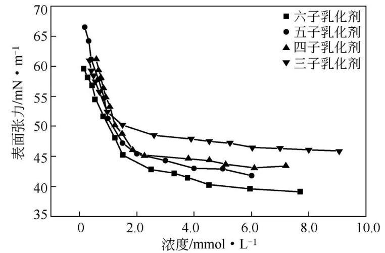 將桐油三酸酐和桐油三酸酐與甲基丙烯酸β羥乙酯反應(yīng)后的產(chǎn)物TM3H1及TM3H2水解,形成羧基官能團數(shù)為4~6的丙烯酸酯改性的桐油基衍生物,TM3H3含有3個羧基。將羧酸改性的桐油用堿等當量中和,形成含3~6個羧酸鈉基團的桐油基衍生物,簡稱為3~6子乳化劑。桐油及乳化劑的表面張力測試結(jié)果如圖5所示,與純水(實測表面張力69mN/m)相比,4種多子乳化劑均能降低水的表面張力。表面張力隨其濃度的增加而下降,當乳化劑濃度大于2.5mmol時,溶液的表面張力隨濃度的變化趨于平穩(wěn),逐漸接近水平。乳化劑濃度為1.5mmol/L時,3~6子乳化劑表面張力分別為50.2mN/m、48.8mN/m、47.2mN/m和45.2mN/m。