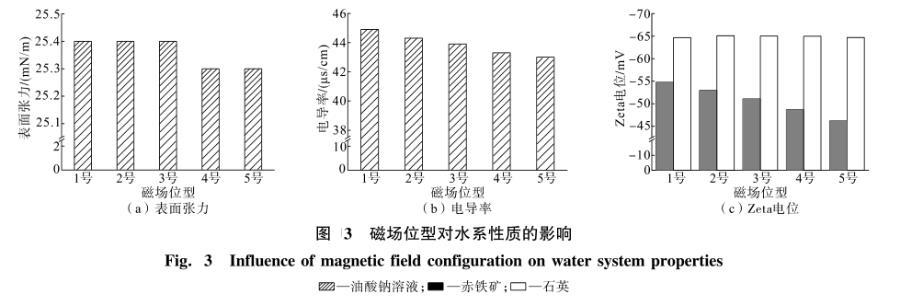 由圖3可知,1號(hào)磁場(chǎng)位型條件下,油酸鈉的表面張力、電導(dǎo)率和赤鐵礦的Zeta電位絕對(duì)值均最大。