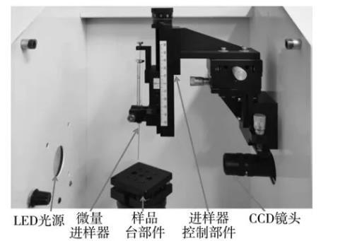 實(shí)驗(yàn)采用SL200A型接觸角儀來(lái)產(chǎn)生液滴,獲取液滴圖像。該儀器的主機(jī)如圖2所示,主要組成部件為:光源控制部件(可調(diào)亮度LED光源)、CCD鏡頭(75 mm焦距,25幀/秒)、進(jìn)樣器控制部件(可升降12.5 mm,0.01 mm微距)、樣品臺(tái)部件(樣品臺(tái)面50×50 mm)、圖像采集卡(25幀/秒)、手動(dòng)控制微量進(jìn)樣器(10、25、50μL)。實(shí)驗(yàn)采用表面張力與接觸角分析系統(tǒng)的CAST2.0軟件控制拍攝過(guò)程。采用連續(xù)拍攝方式,圖像采集速率為25幀/s,連拍100幀,獲取液滴圖像。實(shí)驗(yàn)樣品為黏度系數(shù)為50 mm2/s、100 mm2/s、350 mm2/s、500 mm2/s的硅油,其中黏度系數(shù)為50 mm2/s、100 mm2/s的硅油密度σ為965 kg/m3,黏度系數(shù)為350 mm2/s、500 mm2/s的硅油密度σ為970 kg/m3[14]。