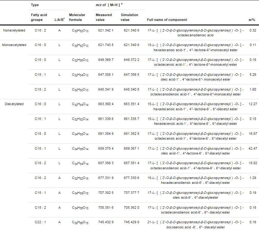 表1、表2和圖3分別顯示了乙?;疭Ls和去乙酰化SLs的同系物組分及3種有代表性的同系物結構圖,從表中可以看出,乙酰化SLs的親水基主要為雙乙?;幕碧牵p乙?;M分高達92.50%;疏水基以十八碳的疏水基為主,其中十八烯酸疏水基質量分數(shù)為47.95%;內(nèi)酯類型的SLs質量分數(shù)為97.86%。去乙?;疭Ls同系物中的疏水基中十八烯酸質量分數(shù)最高,達到27.87%,親水基主要為去乙?;幕碧?,質量分數(shù)為90.56%,即使發(fā)酵菌株被敲除了乙?;P鍵基因,該產(chǎn)物中仍然有9.44%的單乙?;碧侵赡馨麅?nèi)存在其他低效率的乙?;緩剑唧w原因有待進一步研究。去乙?;疭Ls同系物中含有內(nèi)酯型、酸型和bola型SLs,質量分數(shù)分別為26.99%、49.98%和23.03%;而乙?;疭Ls同系物中以內(nèi)酯型為主,質量分數(shù)達到97.86%,酸型同系物質量分數(shù)為2.14%,未發(fā)現(xiàn)bola型SLs。這是由于乙?;疭Ls菌株和去乙?;疭Ls菌株對底物的代謝途徑和效率不同。乙酰轉移酶基因AT的敲除使大部分SLs分子不再發(fā)生乙酰化。在去乙?;疭Ls產(chǎn)品中bola型SLs分子質量分數(shù)高達23.03%,與Saerens等的研究結果一致。