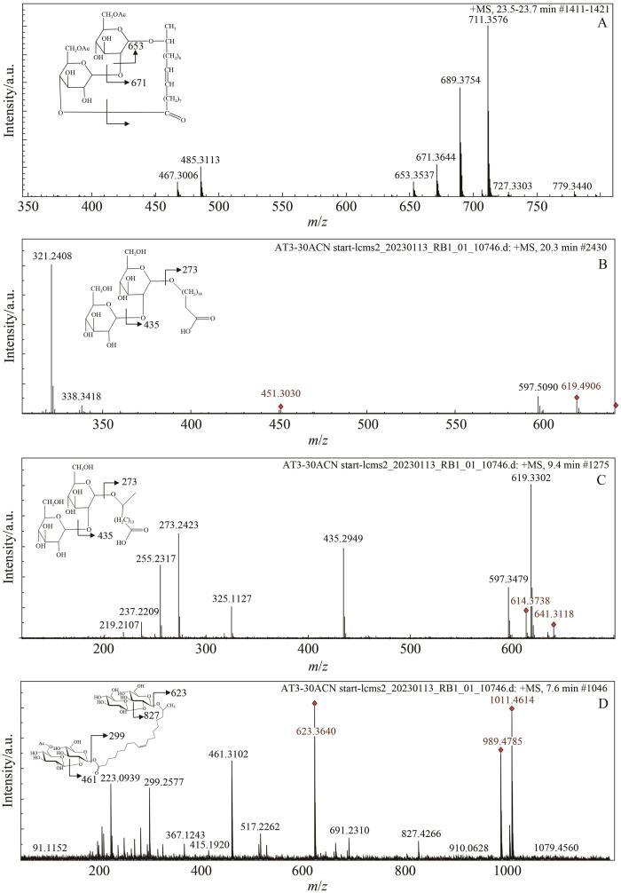 相比較而言,去乙?;疭Ls同系物的保留時間較短,說明這些同系物的極性增大。其中,乙?;疭Ls同系物的總離子流圖(圖1A)中保留時間為23.6 min處的峰的豐度最高,質量分數(shù)為42.47%,其質譜碎片如圖2A所示。質荷比(m/z)為689.3754的峰為具有C18∶1單不飽和脂肪酸部分的二乙?;瘍?nèi)酯型SLs的分子離子峰,m/z 711.3576為[M+Na]+峰,m/z 671.3644和653.3537分別為[M+H]+失去1個水分子和2個水分子的峰,m/z 485.3113和467.3006分別為[M+H]+失去1個己糖環(huán)和再失去1個水分子的峰。上述分析表明,保留時間為23.6 min的組分為帶有單不飽和度的C18脂肪酸鏈的雙乙?;瘍?nèi)酯型SLs,即,17-L-[(2-O-β-D-吡喃葡萄糖基-β-D-吡喃葡萄糖基)-O-]-十八碳烯酸-1,4-內(nèi)酯-6′,6″-二乙酸酯。