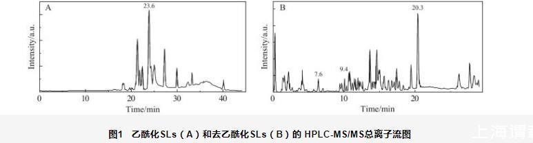 圖1乙?;疭Ls(A)和去乙酰化SLs(B)的HPLC-MS/MS總離子流圖