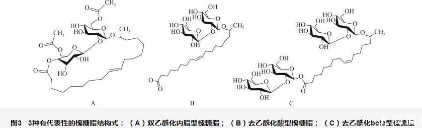 圖3 3種有代表性的槐糖脂結構式:(A)雙乙?;瘍?nèi)脂型槐糖脂;(B)去乙?;嵝突碧侵?;(C)去乙酰化bola型槐糖脂