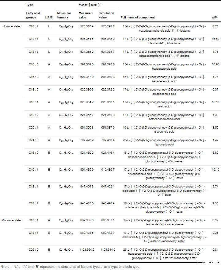 在去乙酰化SLs同系物的總離子流圖中,保留時間為20.3 min的峰具有最高的豐度,達到16.96%,所對應的質譜碎片如圖2B所示,其中,m/z 597.5090為[M+H]+峰,m/z 619.4906為[M+Na]+峰,該組分與保留時間為9.4 min的組分具有相同的[M+Na]+和[M+H]+峰(圖2C),推測這2種組分可能為同分異構體;對于保留時間為9.4 min的質譜圖(圖2C),其中,m/z 619.3302和597.3479分別為[M+Na]+峰和[M+H]+峰,而m/z 435.2949和273.2423分別是[M+H]+失去1個和2個去乙?;募禾黔h(huán)(C6H10O5)形成的,m/z 273.2423(C16H33O3)是質子化的C16∶0羥基脂肪酸。上述分析表明,保留時間20.3和9.4 min的組分分別為ω型和ω-1型C16∶0的去乙?;嵝蚐Ls,即16-L-[(2'-O-β-D-吡喃葡萄糖基-β-D-吡喃葡萄糖基)-O-]-十六酸和15-L-[(2'-O-β-D-吡喃葡萄糖基-β-D-吡喃葡萄糖基)-O-]-十六酸。
