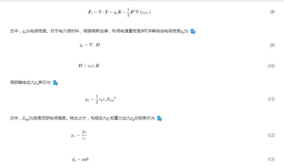 圖4(a)為液滴頂端所受力的方向和液滴整體電荷分布。液滴接觸下極板后,由于離子遷移和極化電荷的產(chǎn)生,中性液滴立即極化,其頂部帶正電荷,底部帶負電荷。根據(jù)庫倫定律,電場方向垂直向上,作用在液滴頂部的靜電力Fe是向上的,與電場方向相同,使液滴不斷向上拉伸,液滴拉伸高度增加,而表面張力Fγ和重力G使液滴向下收縮?;谏鲜龅姆治?,各個模態(tài)的產(chǎn)生機理均可通過靜電力、表面張力和重力三者間的博弈關(guān)系來分析。三種作用力對液滴的影響大小可用局部靜電應(yīng)力pe、毛細應(yīng)力pγ和重力應(yīng)力pg來表示。靜電力的大小由麥克斯韋應(yīng)力張量T的散度給出,可表示為