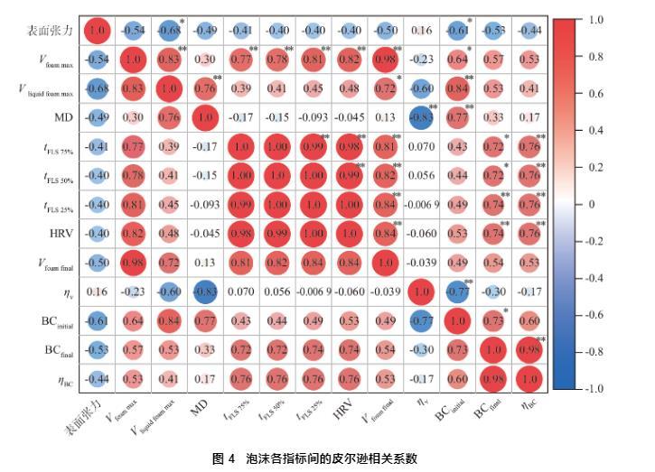 圖4泡沫各指標(biāo)間的皮爾遜相關(guān)系數(shù)