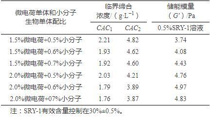 室內(nèi)合成實驗研究發(fā)現(xiàn),微電荷單體對降低CAC2貢獻較大,用量優(yōu)選為1.5%~2.5%,而小分子生物單體對降低CAC1貢獻較大,用量優(yōu)選為0.5%~0.7%,兩種單體共同作用下臨界締合濃度降低和黏彈性提高顯著,最優(yōu)結(jié)果見表3。可見當采用2.0%微電荷單體+0.6%小分子生物單體組合時,溶液具有較強的黏彈性,此時SRY-1的CAC1,CAC2分別為1.79 g·L?1、3.89 g·L?1,對應(yīng)SRY-1用量接近0.18%、0.4%。