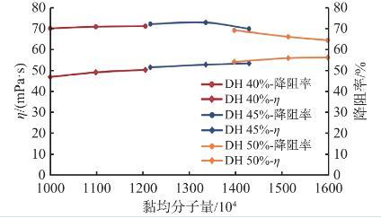 室內(nèi)通過控制水解度(40%~50%)制備了一系列的SRY-1樣品,配制成濃度為0.5%的溶液,測試聚合物不同分子量下的表觀黏度(30 min)和降阻率(Q=45 L/min)。如圖2所示,在優(yōu)化的水解度范圍內(nèi),SRY-1分子量均在1000萬以上,水解度越高,分子量越高;溶液表觀黏度隨分子量的增大而增大,但降阻率隨分子量的增大呈現(xiàn)先緩慢升高后較快降低的趨勢。主要是因為分子量越高,重復(fù)單元數(shù)愈多,分子間越易形成鏈纏結(jié),分子鏈具有更大的流體力學(xué)體積,溶液黏度增大,當增大到一定范圍,溶液黏彈性受到影響,降阻率就隨之下降。由數(shù)據(jù)對比,SRY-1分子量控制在1200~1300萬為宜。