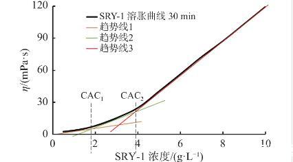 據(jù)研究表明,締合聚合物溶脹經(jīng)歷3個階段,分別對應(yīng)了兩個黏度突變的點,即臨界締合濃度CAC;通過繪制聚合物溶液黏度-濃度曲線,擬合分析得到3個階段的趨勢線及公式,兩兩相交的點取絕對值即為臨界締合濃度值,計算得CAC1,CAC2,如圖3所示。根據(jù)曲線可以看出,在CAC1之前,溶液黏度增長趨勢較緩慢,當達到CAC1并向CAC2過渡時,溶液黏度增長相對加快,超過CAC2后,溶液黏度迅速增加,1.0%用量下終黏可達110 mPa·s以上。