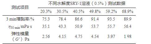 數(shù)據(jù)顯示,隨水解度增大,SRY-1增黏率和表觀黏度都顯著提高,但水解度超過60%后,增黏率又有所降低,SRY-1溶液G'呈現(xiàn)先增大后減小的趨勢。分析認為:在一定范圍內(nèi),由于水解度增大,分子鏈更加伸展,分子間共價鍵作用更易形成彈性微觀網(wǎng)絡(luò)結(jié)構(gòu),彈性模量G'增大;隨著水解度繼續(xù)增大,聚合物分子流體力學(xué)體積持續(xù)增大而很難交叉纏繞,黏性行為明顯,彈性減弱,表現(xiàn)為彈性模量G'減小。因此水解度過度提高會造成增黏率下降,溶液黏性增強,彈性降低的負面影響。由數(shù)據(jù)可知,SRY-1水解度為40%~50%時,SRY-1的3 min增黏率可達90%以上,溶液黏彈性最為顯著。