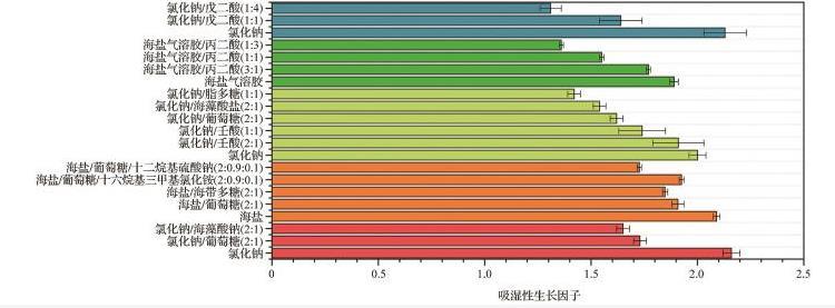 在實(shí)驗(yàn)室中通過(guò)吸濕串聯(lián)差分電遷移率分析儀測(cè)量給定RH下的粒徑與干粒徑的比值,以通過(guò)吸濕性生長(zhǎng)因子來(lái)量化吸濕性。最近許多研究關(guān)注到表面活性物質(zhì)對(duì)顆粒吸濕性的影響。圖4總結(jié)了當(dāng)前一些研究中量化的表面活性物質(zhì)對(duì)SSA模擬物吸濕性的影響。