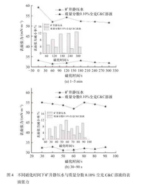 圖4不同磁化時間下礦井靜壓水與質(zhì)量分?jǐn)?shù)0.10%塵克C&C溶液的表面張力