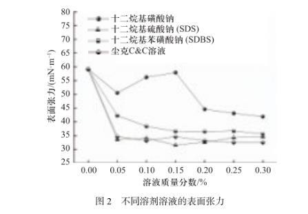 如圖2所示,4種溶液隨著濃度的增加,表面張力逐漸趨于穩(wěn)定。十二烷基磺酸鈉溶液質(zhì)量分?jǐn)?shù)大于0.20%時,溶液表面張力趨于穩(wěn)定。表面張力最小時,溶液質(zhì)量分?jǐn)?shù)為0.30%.十二烷基硫酸鈉(SDS)溶液質(zhì)量分?jǐn)?shù)大于0.05%時,溶液表面張力趨于穩(wěn)定。表面張力最小時,溶液質(zhì)量分?jǐn)?shù)為0.15%.十二烷基苯磺酸鈉(SDBS)質(zhì)量分?jǐn)?shù)大于0.15%時,溶液表面張力趨于穩(wěn)定。表面張力最小時,溶液質(zhì)量分?jǐn)?shù)為0.30%.塵克C&C溶液質(zhì)量分?jǐn)?shù)大于0.05%時,溶液表面張力趨于穩(wěn)定。表面張力最小時,溶液質(zhì)量分?jǐn)?shù)為0.10%.由圖可以看出,相較于十二烷基苯磺酸鈉(SDBS)和十二烷基磺酸鈉,十二烷基硫酸鈉(SDS)和塵克C&C可以較大程度地降低溶液的表面張力,提高溶液對低水分無煙煤顆粒的濕潤性。同時,考慮到塵克C&C溶液具有無腐蝕、無污染、可生物降解、不造成二次污染的特性,最終選擇質(zhì)量分?jǐn)?shù)0.10%塵克C&C溶液作為最優(yōu)表面活性溶液。