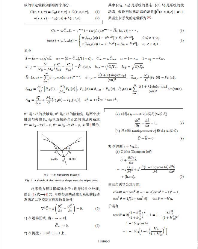 將系統(tǒng)方程以振幅遠(yuǎn)小于1進(jìn)行線性化處理,結(jié)合(1)式—(4)式,可以得到共晶生長(zhǎng)系統(tǒng)的擾動(dòng)態(tài)滿足以下控制方程和邊界條件: