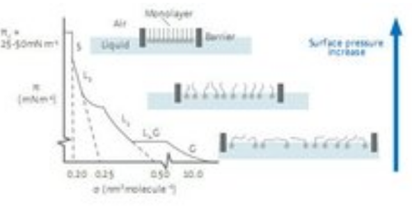在進(jìn)行典型的等溫壓縮測試時,單分子層先從二維的氣相(G)轉(zhuǎn)變到液相(L)最后形成有序的固相(S)。在氣相中,分子間的相互作用力比較弱;當(dāng)表面積減小,分子間的堆積更為緊密,并開始發(fā)生相互作用;在固相時,分子的堆積是有序的,導(dǎo)致表面壓迅速增大。當(dāng)表面壓達(dá)到最大值即塌縮點(diǎn)后,單分子層的堆積不再可控(圖1)。