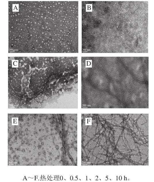圖2加熱不同時(shí)間形成的β-乳球蛋白納米纖維的透射電子顯微鏡圖
