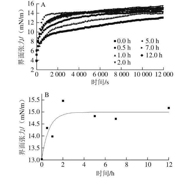 圖3纖維化過程中β-乳球蛋白在油水界面的吸附動(dòng)力學(xué)過程(A)及其飽和界面張力(B)的變化