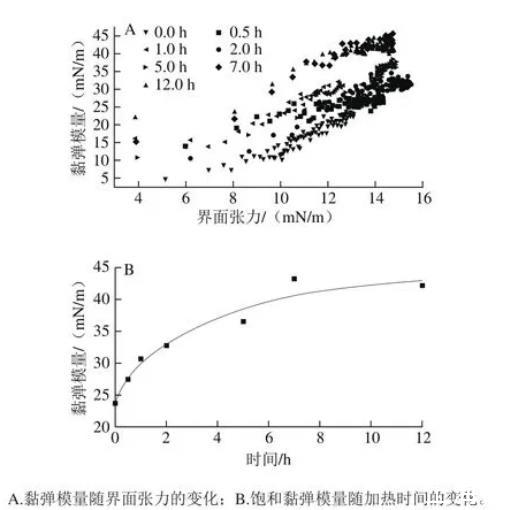 乳液的形成及穩(wěn)定性決定于界面物質(zhì)的吸附行為和界面膜的黏彈模量。采用懸滴法對β-乳球蛋白纖維化轉(zhuǎn)變過程中不同階段產(chǎn)物的界面吸附動(dòng)力學(xué)過程和界面膜的黏彈模量進(jìn)行研究。圖3A為各階段產(chǎn)物在油-水界面的界面張力隨時(shí)間的變化。可以觀察到,所有樣品的界面張力隨吸附時(shí)間逐漸上升,意味著不同階段產(chǎn)物均具有界面吸附行為。一段時(shí)間后界面張力上升速度趨于平緩,表明物質(zhì)在界面上的吸附逐漸達(dá)到飽和。從圖3B可以發(fā)現(xiàn),纖維化轉(zhuǎn)變不同階段的產(chǎn)物,其平衡界面張力存在區(qū)別。在開始階段,飽和界面張力隨蛋白加熱時(shí)間的延長而升高,當(dāng)加熱時(shí)間超過2 h后,飽和界面張力的變化不再明顯。綜合上述分析可以看出,在熱處理的初始階段,蛋白質(zhì)發(fā)生了水解,這一現(xiàn)象使得蛋白質(zhì)分子質(zhì)量變小,而擴(kuò)散速度增加,因而相對未水解的蛋白能達(dá)到更高的飽和界面張力。盡管過度水解會(huì)導(dǎo)致蛋白質(zhì)界面活性的破壞,但后期隨著納米纖維的形成,混合體系的整體界面活性仍然能保持較高水平。