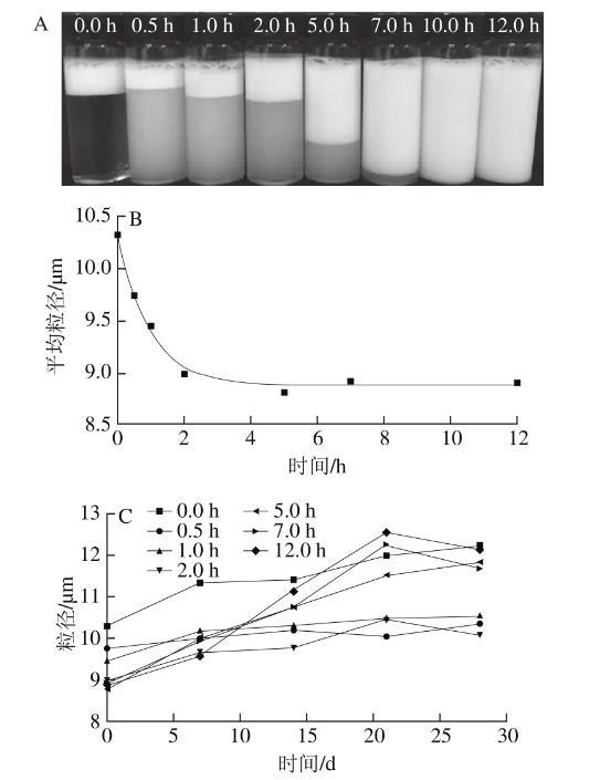 圖5纖維化轉(zhuǎn)變過程中β-乳球蛋白納米纖維穩(wěn)定的乳液外觀(A)、平均粒徑(B)和常溫貯藏時(shí)粒徑(C)的變化