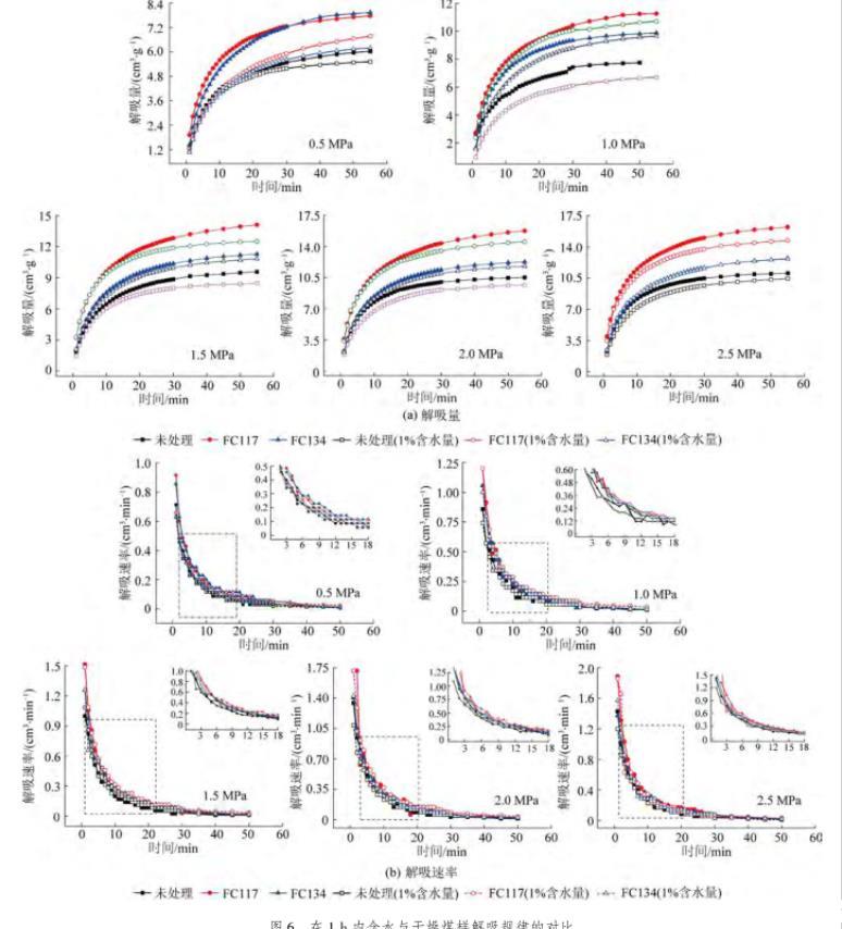 由圖6a可知,隨著甲烷吸附平衡壓力的增加,3種處理方式的含水煤樣解吸量均逐漸增加,且增加量均呈現(xiàn)逐漸減小趨勢。經(jīng)過氣潤濕反轉劑FC117和FC134處理后的含水煤樣解吸量始終大于未處理的煤樣,與干燥煤樣解吸量的規(guī)律基本一致。同時,在3種不同處理方式條件下,干燥煤樣的解吸量均大于含水條件下的解吸量,其結果表明在含水煤樣解吸過程中存在一定程度的水鎖效應。