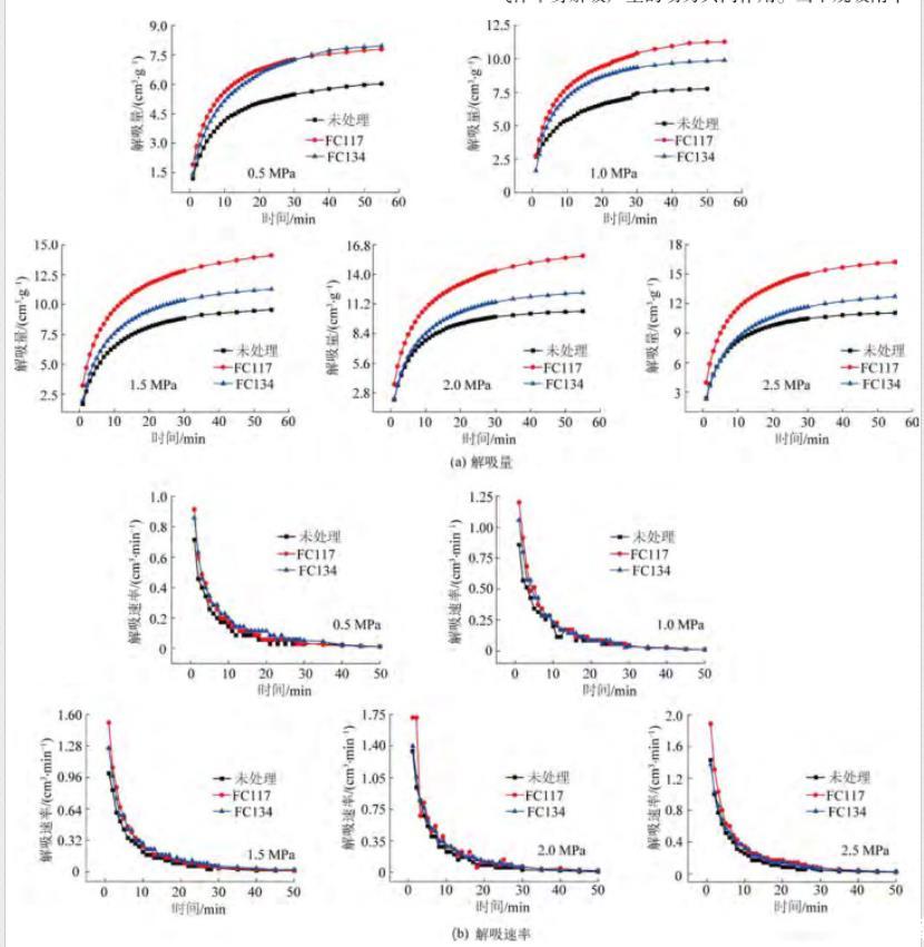 為了得到氣潤濕反轉劑處理前后含水(1%含水率)煤樣的解吸規(guī)律,依次對不同吸附平衡壓力條件下的煤樣進行解吸試驗,通過對比干燥與含水煤樣的解吸量和解吸速率,進而定量分析氣潤濕反轉劑消除水鎖效應,如圖6所示。