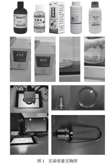 為了還原物理現(xiàn)象,初步探究液滴爆炸的原因,本文首先進行了預(yù)實驗。實驗中所用到的物品包括:醫(yī)用75%酒精和蒸餾水混合形成水混合物液滴,家用菜籽油用作油池,普通藍(lán)墨水染色。在室溫環(huán)境下進行實驗,預(yù)實驗中發(fā)現(xiàn)普通藍(lán)墨水染色現(xiàn)象不明顯,改進為采用甲基藍(lán)染色劑進行染色。正式實驗時準(zhǔn)備了不同種類的水混合物(乙醇、二乙二醇丁醚),不同種類的疏水性物質(zhì)(硅油、花生油、蓖麻油),不同厚度的疏水性物質(zhì)(5 mm、10 mm),設(shè)置合適的濃度梯度,采用恒溫水浴鍋來測定溫度。在顯微鏡下觀察液滴的運動過程,精準(zhǔn)測定液滴大小,利用注射器定量控制滴入液滴的體積,再利用黏度計測量黏性系數(shù),并對實驗誤差進行了修正。