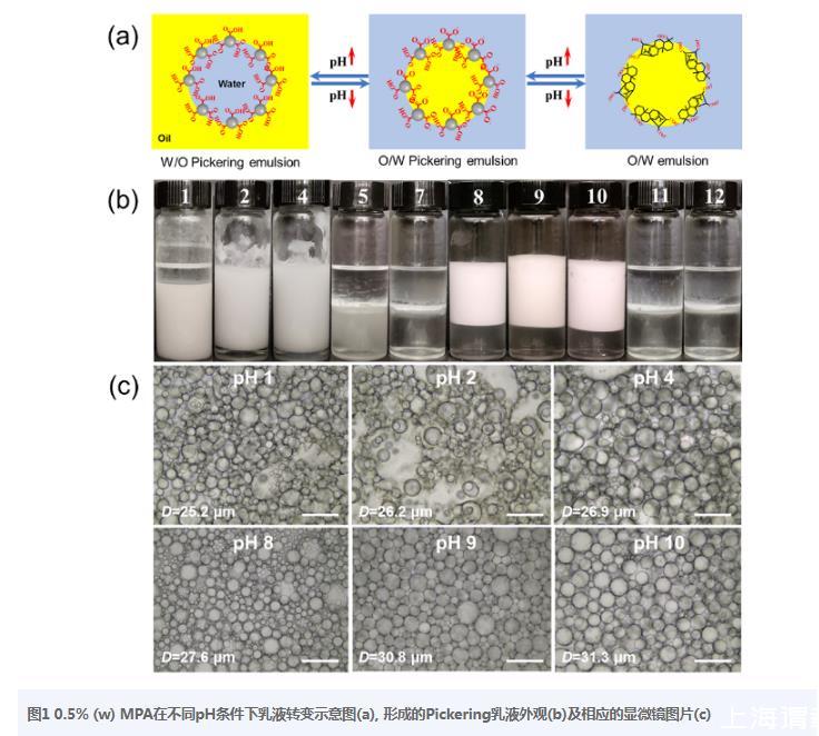 圖10.5%(w)MPA在不同pH條件下乳液轉(zhuǎn)變示意圖(a),形成的Pickering乳液外觀(b)及相應(yīng)的顯微鏡圖片(c)