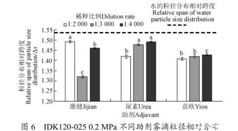 此試驗(yàn)條件下自來水的粒徑相對(duì)分布跨度為1.544。3種助劑溶液霧滴粒徑相對(duì)分布跨度Δ受溶液配比因素影響程度不同。激健溶液1:3 000配比條件下對(duì)霧滴粒徑相對(duì)分布跨度影響最為顯著,為1.320,與水相比減小14.50%,明顯優(yōu)于該條件下其他各組數(shù)據(jù)。與尿素相比,意歐助劑在各濃度比例下對(duì)霧滴粒徑相對(duì)分布影響保持在降低8%左右,改善效果更優(yōu),且受濃度變化影響小。