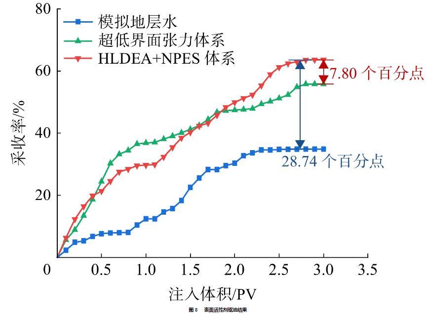 3)HLDEA+NPES體系可將原油采收率提高至63.60%,在水驅(qū)基礎(chǔ)上提高了28.74個(gè)百分點(diǎn),在超低界面張力體系驅(qū)基礎(chǔ)上提高了7.80個(gè)百分點(diǎn)。