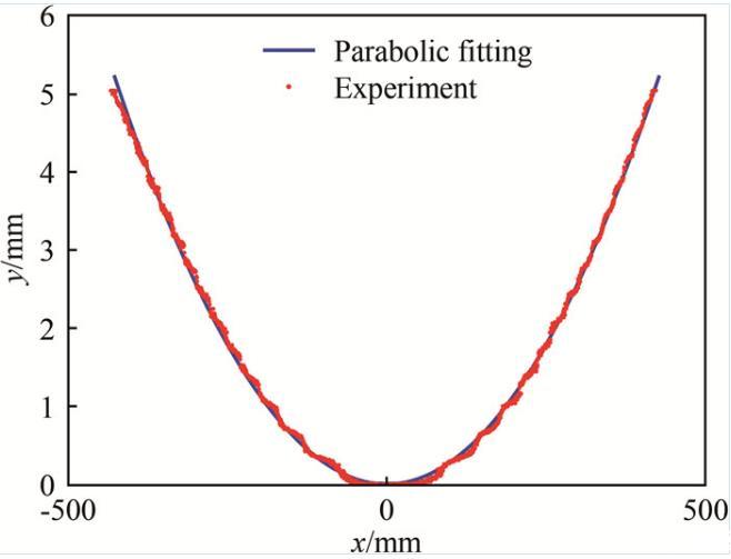Sane等推導(dǎo)了表面張力系數(shù)與尼龍繩曲線方程的關(guān)系,但并未獲得曲線方程的精確解,而是采用高階多項式對實測曲線進(jìn)行擬合,發(fā)現(xiàn)選取二階多項式可以得到較好的結(jié)果,從而也獲得了式(10),并通過擬合系數(shù)得到了表面張力系數(shù)。本文的嚴(yán)格推導(dǎo)說明:流道邊界曲線是拋物線加上高兩階小量的修正。圖(2)也證明了這一推導(dǎo)結(jié)論的正確性。