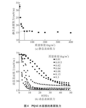 因此,本文采用芬蘭Kibron公司的表面張力儀在20一22℃下研究了溶液的界面性質(zhì),如靜態(tài)和動(dòng)態(tài)表面張力。不同PQAI溶液的靜態(tài)表面張力的變化如圖4(a)所示??梢钥闯?,在去離子水中加人少量表面活性劑,溶液的表面張力急劇下降。然而,在質(zhì)量濃度>0.04kg/m2時(shí),下降趨勢開始緩慢。這意味著PQAI水溶液的pcMc~0.04kg/m2,此時(shí)表面活性劑水溶液靜態(tài)表面張力為16.07mN/m。